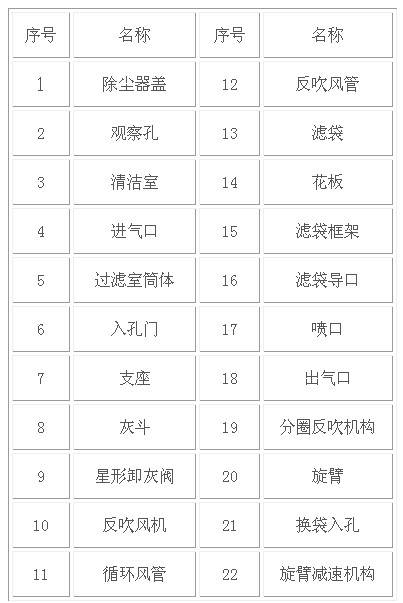 _說一下機械回轉反吹扁袋除塵器,它是由四部分組合而成的,1、上箱體,包括除塵器蓋,旋轉揭蓋裝置、清潔室、換袋入孔、觀察孔、出氣口。2、中箱體,包括花板、濾袋、濾袋框架、濾袋導口、過濾室筒體、進氣口、入孔門。3、下箱體,包括定位支承架、灰斗、星形卸灰閥、支座。4、反吹風清灰機構,包括旋臂、噴口、分圈反吹機構、循環風管、反吹風管、反吹風機、旋臂減速機構。