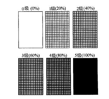 林格曼煙氣濃度圖是 19 世紀末法國的林格曼提出的。這種方法是把圖放置在適當的位置上,使圖上的黑度與煙氣的黑度(或不透光度)相比較,憑視覺進行評價。在工業爐窯大氣污染物排放標準中,排放限制(除非金屬焙燒爐窯外)為煙氣黑度不大于 1 級。林格曼圖有多種規格,通用標準形式是由 14c m ×21cm 的黑度不同的 6 小塊組成。除全白與全黑塊 2 外,其他 4 塊是在白色背底上畫上不同寬度的黑色條格。根據黑色條格在整修小塊中所占的面積的百分數分成 0-5 的林格曼級數: 0 級是全白, 5 級是全黑, 1 級是黑色條格占整塊面積的 20% , 2 級占 40% ,以此類推,如圖