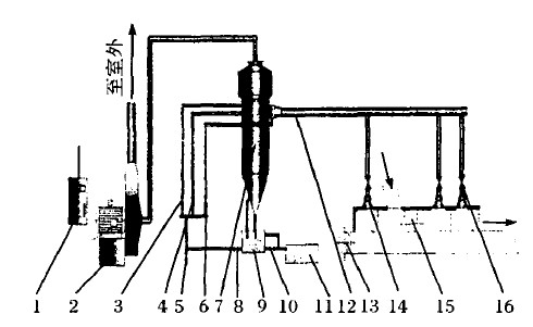 1、程控柜2、專用風(fēng)機3、內(nèi)筒進(jìn)水閥4、外筒進(jìn) 水閥5、給水閥(電動或手動)6、備用旁路閥7、DSX型濕式除塵器8、排污沖洗閥9、自溢式水箱10、排污閥11、粉煤灰池12、吸塵管路13、輸煤皮帶14、吸塵罩15、雙層導(dǎo)料槽16、風(fēng)量調(diào)節(jié)閥