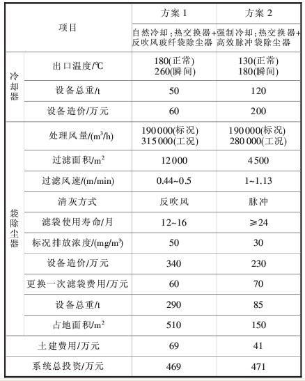 從表1可以看出,方案一中自然冷卻熱交換器的冷卻效率不及強制冷卻熱交換器;另外,由于熟料粉塵磨蝕性強,玻纖袋抗磨蝕性差,抗折性差,其壽命通常僅一年,使用費用高。方案二盡管設備投資要略高一點,但其濾袋使用壽命長,占地面積小,對粉塵處理能力強,能適應大規格生產,系統運行參數優于方案一。因此,我們推薦方案二為_方案。